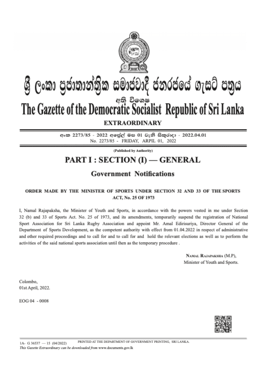 මෙම සම්පූර්ණ විවාදය ආරම්භ වන්නේ 2022 අප්රේල් 1 දිනයි. එදින ක්රීඩා අමාත්ය නාමල් රාජපක්ෂ, ශ්රී ලංකා රග්බි විධායක මණ්ඩලය විසුරුවා හැර එය ක්රීඩා සංවර්ධන අධ්යක්ෂ ජනරාල්ගේ පාලනය යටතට ගෙන ගියේය.