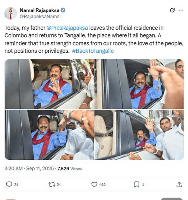 හිටපු ජනාධිපති මහින්ද රාජපක්ෂ මහතාට සිය විජේරාමයේ පිහිටි නිල නිවසට සමුදීමට සිදුවීම සම්බන්ධයෙන් ඔහුගේ පුත් පාර්ලිමේන්තු මන්ත්රී නාමල් රාජපක්ෂ මහතා ‘X’ ගිණුමෙහි සටහනක් තබා තිබේ.