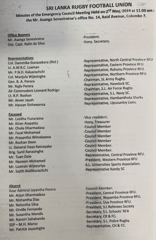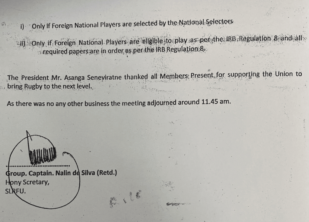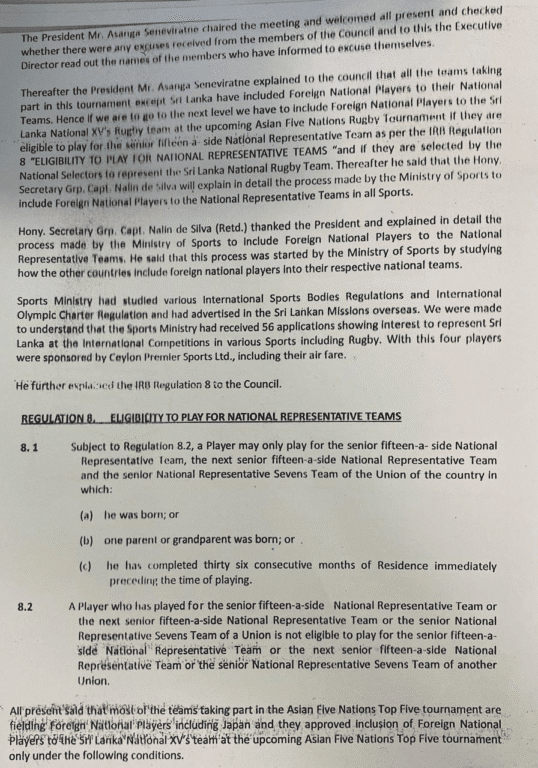 රැස්වීමේදී, SLR සභාපති අසංග සෙනෙවිරත්න විසින් ශ්රී ලංකා කණ්ඩායමේ ඉහළ ශ්රේණිගත මට්ටමකට ගෙන යාමට නම් විදේශීය ක්රීඩකයින් අත්යවශ්ය බව ප්රකාශ කරන ලදී. ඔහු සුදුසුකම් පිළිබඳ IRB රෙගුලාසි 8 ක්රියාත්මක කළ නමුත්, ෆීජි ජාතිකයන් තිදෙනාගෙන් කිසිවෙකු උපත, දෙමාපියන් හෝ මාස 36 ක පදිංචිය යන නිර්ණායක සපුරා නොමැති බව පහසුවෙන් නොසලකා හැරියේය.