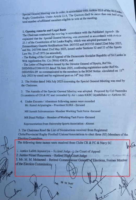 සුනිල් කුමාර ගමගේ යටතේ ක්රීඩා අමාත්යාංශය, ආරම්භයේ සිට අවසානය දක්වා මැතිවරණ ක්රියාවලිය වැරදි ලෙස හසුරුවා ඇත. අමාත්යාංශය බලාත්මක කරන ලද ව්යවස්ථාවම, මැතිවරණ සහ අභියාචනා යාන්ත්රණයන් දෙකම පාගා දමා සාධාරණත්වය ප්රතික්ෂේප කර ඇත. ලෝක රග්බි මඟින් 2025 ඔක්තෝබර් 9 වන දින සිට වසර දෙකක අත්හිටුවීමකට තර්ජනය කරන නමුත්, අමාත්යාංශය අත්හිටුවීම වළක්වා ගැනීමට මංමුලා සහගතව, දූෂණයට මුහුණ දීමට අකමැතිව, පද්ධතිය හසුරුවන අයව ආරක්ෂා කිරීමට තෝරා ගැනීමෙන් ඉදිරියට යයි.
