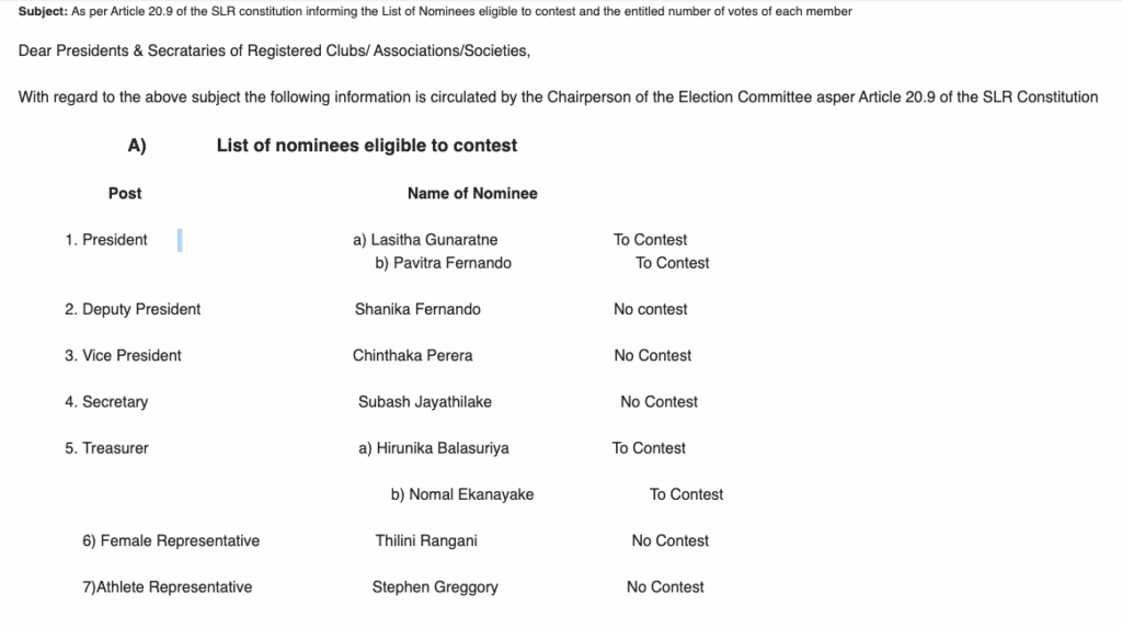 2025 සැප්තැම්බර් 30 වන දින SLR හි විධායක අධ්යක්ෂ චූලා ආරියරත්න විසින්, මහනුවර ක්රීඩා සමාජයේ (නියෝජ්ය සභාපති) ප්රදීප් බස්නායක සහ හැව්ලොක් ක්රීඩා සමාජයේ (උප සභාපති) S.W. Chang වැනි ගෞරවනීය නාමයෝජනා එකදු පැහැදිලි කිරීමකින් තොරව ලැයිස්තුවෙන් ඉවත් කර ඇති බව සනාථ කරන විද්යුත් තැපෑලක් බෙදා හැරීමත් සමඟ අර්බුදය තවත් උග්ර විය. සමස්ත ක්රියාවලියේ සාධාරණත්වය සහ විනිවිදභාවය පිළිබඳව බරපතල සැකයන් මතු විය.