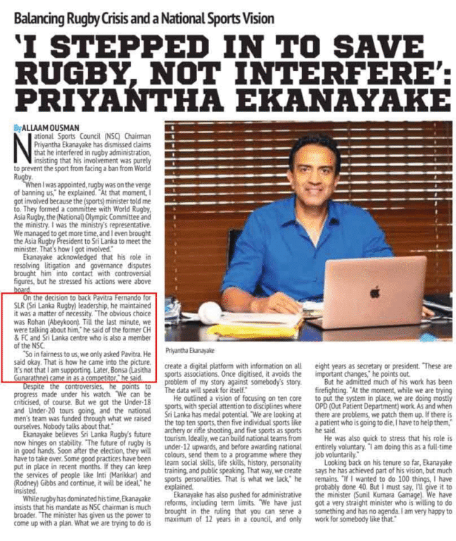 ශීර්ෂ පාඨය:SLR සභාපති ධුරය සඳහා පවිත්රා ප්රනාන්දුට සහාය දැක්වීමට ගත් තීරණය තමන් විසින් ගත් බව NSC සභාපති ප්රියන්ත ඒකනායක මහතා පාපොච්චාරණය කළ බව ඩේලි මිරර් පුවත්පතේ පළ වූ පුවතකින් තහවුරු වේ.
