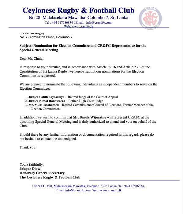 CR & FC කණ්ඩායමේ සාමාජිකයින් ඉහළම තනතුරුවලට පත් කිරීමට ඔවුන් ගත් අධිෂ්ඨානය, ක්රීඩා පිටියේදී සහ ඉන් පිටත සාධාරණත්වය පිළිබඳව බරපතල සැකයන් මතු කර තිබේ. ඔවුන් තම අපේක්ෂකයින් ඉදිරිපත් කළා පමණක් නොව, අපක්ෂපාතීත්වය සහතික කිරීම සඳහා නිර්මාණය කරන ලද මැතිවරණ කමිටුව සඳහා නම් ද ඉදිරිපත් කළ බව පැහැදිලිය, නමුත් Kandy SC, CH & FC සහ Havelocks SC වැනි අනෙකුත් ගෞරවනීය සමාජවල නම් ප්රතික්ෂේප කරන ලදී.
