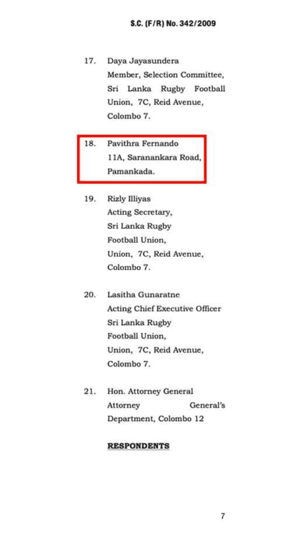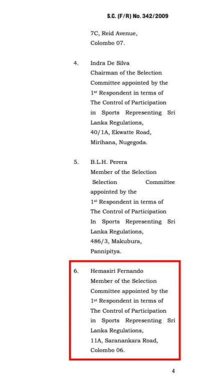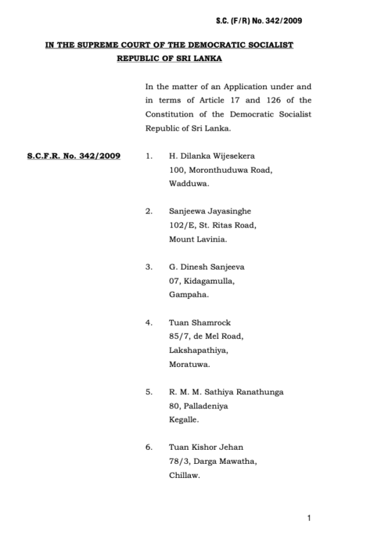 S.C.F.R යටතේ නඩුව ගොනු කරන ලදී. අංක 342/2009 සහ ලැයිස්තු පෙත්සම්කරුවන් වූයේ: එච්. දිලංක විජේසේකර, සංජීව ජයසිංහ, ජී.දිනේෂ් සංජීව, තුවාන් ෂැම්රොක්, ආර්. එම්. එම්. සතියා රණතුංග, ටුවාන් කිෂෝර් ජෙහාන්, එරංග ස්වර්ණතිලක, සෆීර් ජාන්, එස්.මාක්, කේ.ඒ. දොන් සජිත් සාරංග, ඩබ්ලිව්. එම්.ප්රසාද් චතුරංග, ටී.මොහොමඩ් ෆාසිල් මර්ජ්ජ, ගයාන් වීරරත්න, මොහොමඩ් ෂෙරිෆ් සහ එච්.රතිකා අයි.හෙට්ටිආරච්චි.