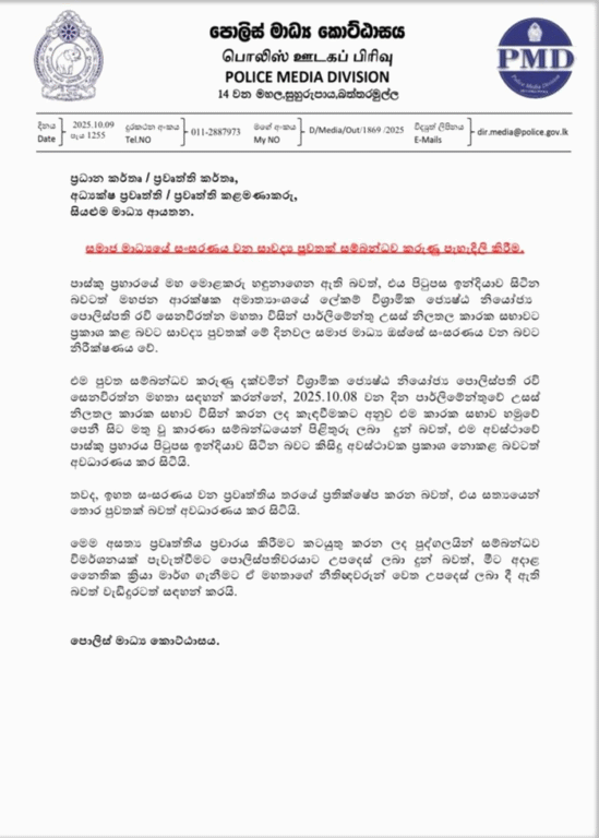 මේ සම්බන්ධයෙන් පළවූ වාර්තා ප්රතික්ෂේප කරමින් පොලිසිය පැහැදිලි කළේ ඒවා අසත්ය සහ පදනම් විරහිත බවයි.